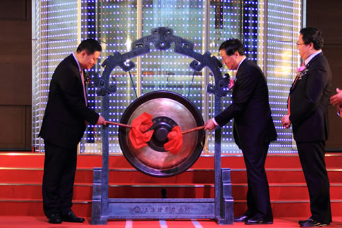 省委常委、市委書記吳存榮(右)與合肥合鍛機床股份有限公司董事長嚴建文(左)為股票開市鳴鑼