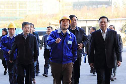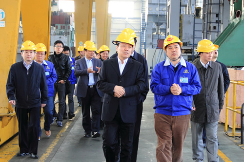中國科協黨組書記尚勇(右一)在安徽省科協黨組書記王洵(右二)、合肥市副市長劉曉平、合肥經開區管委會副主任孫余洲(左三)等領導的陪同下蒞臨合鍛股份 在公司重型裝配車間,嚴建文董事長介紹了公司近年在科技創新方面所取得的成就,重點匯報了公司代表性智能鍛壓產品以及連續承擔四項“高檔數控機床與基礎制造裝備科技重大專項”成果情況。并將企業科協自成立以來相繼開展的“科技技術獎”評比、創新方法培訓等卓有成效的工作向尚勇書記作了匯報。