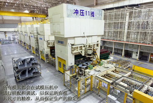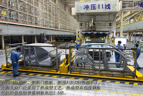 三廠配備了國際領(lǐng)先的試模壓機(jī),所有模具在這里進(jìn)行研配和調(diào)試,保證所有模具尺寸精準(zhǔn),從而保證生產(chǎn)的穩(wěn)定性。 而針對車身側(cè)圍、底板等區(qū)域,上海大眾汽車也同樣采用了整體沖壓成形的工藝,例如,將分為幾個零件分別沖壓的地板做為一個整體零件進(jìn)行沖壓成形,使得車身有了良好的地基;將分段側(cè)圍改為整體側(cè)圍,加強(qiáng)了車身的整體性。這種整體沖壓成形的工藝雖然加大了沖壓難度和對板材的要求,但這種整體的車身零件避免了二次焊接,能夠有效地加固車身強(qiáng)度,并兼顧了整體沖壓的延展性。