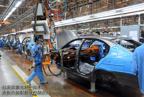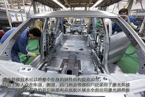 為了保證車身焊接工藝的精確性,上海大眾車身車間大量采用了機(jī)器人自動焊接,生產(chǎn)線可實現(xiàn)多車型的混線生產(chǎn)。此外,分布于車身主線的在線測量技術(shù),在全車間的四個在線測量工位,采用激光、視覺傳感器、圖像處理以及計算機(jī)控制等技術(shù)實現(xiàn)物體空間尺寸的精密測量通過14臺測量機(jī)器人監(jiān)控802個點,對白車身的重要尺寸實行100%監(jiān)控。