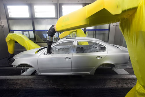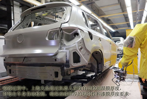 在涂面漆環(huán)節(jié),首先由鴕鳥毛去離子風(fēng)刀對車身表面進(jìn)行全面清潔,隨后由全自動噴涂機(jī)器人對外表面進(jìn)行機(jī)器人高仿性全自動靜電噴涂。先進(jìn)的4套ABB機(jī)器人噴膠系統(tǒng)實現(xiàn)寬帶可控的帶狀效果,減少原料成本,減少車身重量。 噴漆過程中,噴漆室采用了干式漆霧吸收系統(tǒng),通過循環(huán)空氣及石灰石吸收漆霧,取消了水循環(huán)系統(tǒng),避免自來水的損耗和廢水的產(chǎn)生,其空氣循環(huán)使用的比例高達(dá)95%,更加環(huán)保和節(jié)能。為了保證整個噴涂工藝的質(zhì)量,在噴漆過程中,上海大眾通過機(jī)器人在線自動檢測濕膜厚度,對每臺車身自動檢測,確保油漆膜厚的均勻性和漆膜厚度要求。