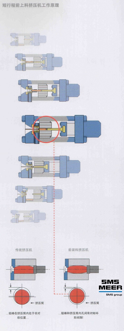 西馬克梅爾的施羅曼輕金屬擠壓機現在的典型產品是短行程前上料擠壓機。其特有的前上料技術由西馬克梅爾開發研制,已經在世界范圍內得到客戶的確認和青睞。目前,西馬克梅爾公司可以提供從10MN最大到160MN的不同規格的輕金屬擠壓機。