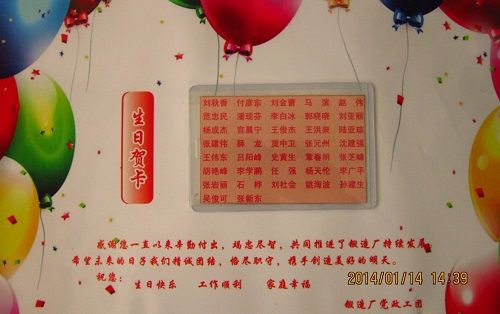 新年伊始,一拖鍛造廠不僅給每位元月份過生日的員工奉上一份由黨政工團聯合簽名的生日賀卡,而且通過內部網站、廣為張貼等形式將“生日祝賀”在全廠范圍內發布,讓更多的人為這些“壽星”送去衷心的祝福,使他們在寒冷的臘月感覺到了濃濃的暖意。