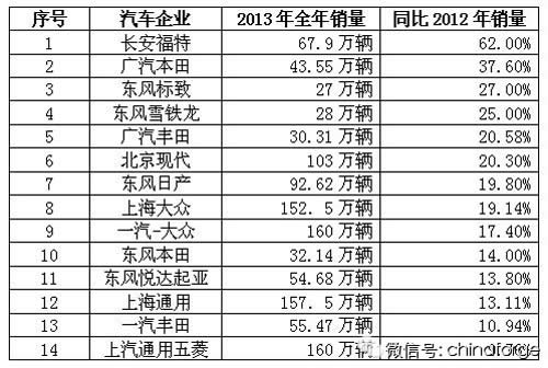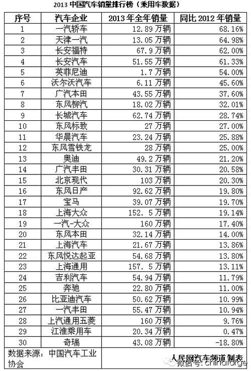 在剛剛過去2013年,中國(guó)汽車市場(chǎng)整體增長(zhǎng)依然十分強(qiáng)勁。據(jù)中國(guó)汽車工業(yè)協(xié)會(huì)統(tǒng)計(jì)分析,中國(guó)全年汽車產(chǎn)銷跨上2000萬輛臺(tái)階,全國(guó)汽車產(chǎn)銷2211.68 萬輛和2198.41 萬輛,比上年分別增長(zhǎng)14.8%和13.9%,比上年分別提高10.2和9.6個(gè)百分點(diǎn),增速大幅提升,高于年初預(yù)計(jì)。產(chǎn)銷突破2000萬輛創(chuàng)歷史新高,再次刷新全球記錄,已連續(xù)五年蟬聯(lián)全球第一。 以上數(shù)據(jù)表明,2013年的中國(guó)車市可謂全線飄紅,細(xì)分到各個(gè)企業(yè),就是增長(zhǎng)比例不同,大部分車企同比2012年銷量都達(dá)到了兩位數(shù)的高速增長(zhǎng),尤其是日系車,得到了全面的復(fù)蘇,只有個(gè)別自主品牌,出現(xiàn)了一定的下滑。 從上面的統(tǒng)計(jì)表可以看到,在國(guó)產(chǎn)車中一汽轎車增速最為迅猛,雖然總臺(tái)數(shù)僅有12.89萬輛,但同比2012年銷量增幅達(dá)68.16%。而進(jìn)口車中,英菲尼迪在2013年表現(xiàn)搶眼,銷售1.7萬輛同比增幅達(dá)54%。在合資車企中長(zhǎng)安福特銷售67.9萬輛,同比2012年增幅62%。而銷量最高的上汽通用五菱去年完成160萬輛,同比增長(zhǎng)9.76%。而日系車企中,廣汽本田依舊表現(xiàn)搶眼,去年銷售43.55萬輛,同比增長(zhǎng)37.6%,而兄弟企業(yè)廣汽豐田增長(zhǎng)也不錯(cuò),2013年銷售30.31萬輛,同比2012增長(zhǎng)20.58%。 1、合資車企 長(zhǎng)安福特2013年大爆發(fā)