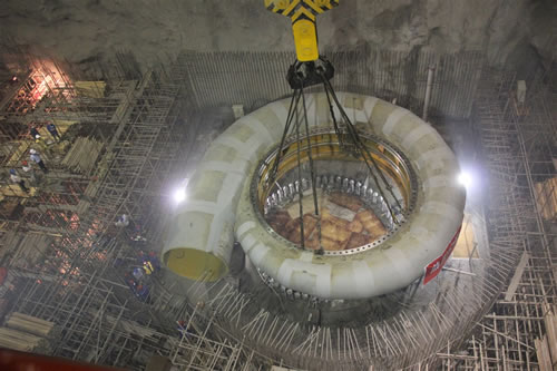 圖為仙居抽水蓄能電站2014年6月9日吊裝的首臺(tái)機(jī)組座環(huán)、蝸殼