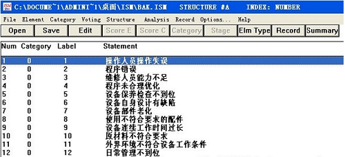 前因集:可以到達要素Si的要素集合定義為要素Si的前因集,用A(Si)表示,由可達矩陣中第Si列中的所有矩陣要素為1的行所對應的要素組成。 最高級要素集:一個多級遞階結構的最高要素集,是指除了可以到達自己本身外,不能到達其它要素的要素組成的集合。其可達集R(Si)中只包含它本身的要素集,而前因集中,除包含要素Si本身外,還包括可以到達它的下一級要素。 若R(Si)=R(Si) HA(Si)這里i=j,則R(Si)即為最高級要素集。 找出最高級要素集后,即可將其從可達矩陣中劃去相應的行和列,接著,再從剩下的可達矩陣中繼續尋找新的最高級要素。以此類推,可以找出各級所包含的最高要素集。 2)通過ISM模擬軟件建立可達矩陣,如圖1所示。