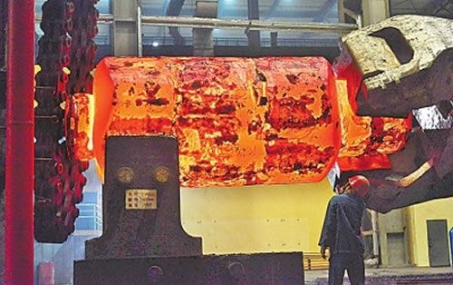 中信重工機械股份有限公司為德國孟克公司(MENCK)制造的重達271.42噸的砧子,在18500噸油壓機上采用438噸大鋼錠進行鍛造。該砧子直徑為6.775米,屬于多臺階餅類鍛件,形狀復雜,鍛造難度高、成型難度大。