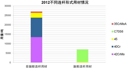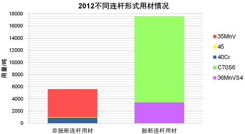 接受統(tǒng)計的成員單位,其連桿產(chǎn)量總數(shù)為1750萬件,占總乘用車連桿的比例約為28%。 三、商用車 2012年,商用車非脹斷連桿用42CrMo超過13500噸,40Cr超過10000噸。在生產(chǎn)過程中,非脹斷連桿的材料利用率約為69-78%;脹斷連桿用C70S6超過6600噸,材料利用率約為47-77%。總的來說,42CrMo用材約占40%,40Cr用材約占30%,C70S6約占20%。