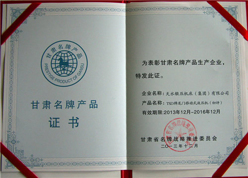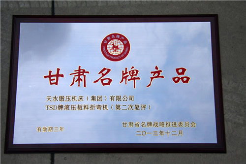 在4月2日召開的天水市推進質(zhì)量和實施商標(biāo)戰(zhàn)略工作會議上,表彰和獎勵了2013年度甘肅省名牌產(chǎn)品生產(chǎn)企業(yè),天水鍛壓機床(集團)有限公司TSD牌液壓板料折彎機和TSD牌龍門移動式液壓機兩項產(chǎn)品獲得“2013年度甘肅名牌產(chǎn)品”稱號獲得了表彰和獎勵。