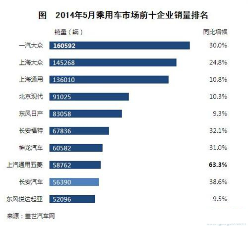 根據蓋世汽車網整理的數據,今年5月,我國乘用車市場前十企業依次是一汽大眾、上海大眾、上海通用、北京現代、東風日產、長安福特、神龍汽車、上汽通用五菱、長安汽車和東風悅達起亞。 2014年5月乘用車市場前十企業銷量排名