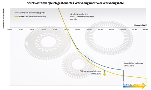 據分析工具eCon顯示,一個可控模具的年產量便可達到100,000件轉子與定子,半年內便可收回投資成本。這不難理解:年產量越高,零部件成本降低得就越多(最多可達10%)。此外,節省出的時間還將有助于產能提升,最多可達15%。