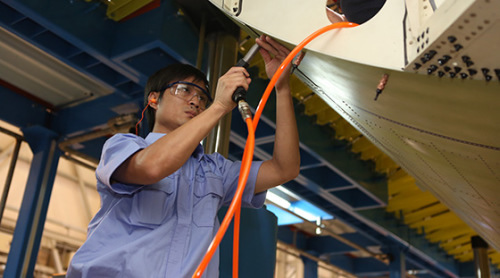 為此,在飛機各大部段研制過程中,中國商飛積極推進項目組織變革,組建技術、工藝、制造聯合工程團隊,攻克關鍵技術,提高研制效率。在中國商飛總裝制造中心,承擔機體結構對接工作的部裝廠房,由中央翼裝配、中機身裝配、水平尾翼裝配和全機對接4條生產線組成;這4條生產線采用了自動化制孔、鉆鉚設備、自動測量調姿對接系統、自動引導運輸車、飛機移動系統等先進設備,是具有國際先進水平的民機部件自動化裝配生產線,使得裝配效率和質量大幅提升。