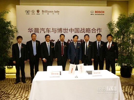 10月15日,華晨汽車集團控股有限公司與博世(中國)投資有限公司在沈陽簽署戰略合作協議,華晨汽車集團董事長、總裁祁玉民,博世(中國)投資有限公司總裁陳玉東博士出席了簽約儀式,雙方約定將在整車及新技術開發方面展開全面的深入合作。
