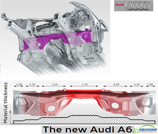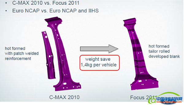 奧迪A6的VRB與熱成形復合工藝強擋板加強橫梁 福特使用VRB技術制作B柱的例子是眾所周知的。通過VRB技術改造,將B柱和其加強板合并成為一個零件,減重1.4kg,達10%。 FOCUS的VRB與熱成形復合工藝B柱。