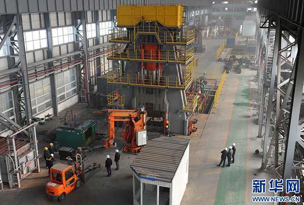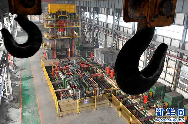 11月30日,在位于河北唐山高新區的二十二冶集團精密鍛造有限公司精鍛車間內,操作工在用1.2萬噸多向模鍛液壓機鍛壓多向閥體。日前,由二十二冶集團精密鍛造有限公司自主設計研發、自主制造的1.2萬噸大型多向模鍛件生產線正式投產。該項目總投資3.6億元,于2012年啟動,運用預應力鋼絲纏繞新技術,攻克了大口徑高溫高壓鍛造閥門制造技術難題,具有精密、高效、低耗等技術優勢,可廣泛應用于航空、航天、核電、石油和化工等行業整體、大型、復雜零件的成形加工制造。