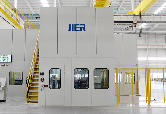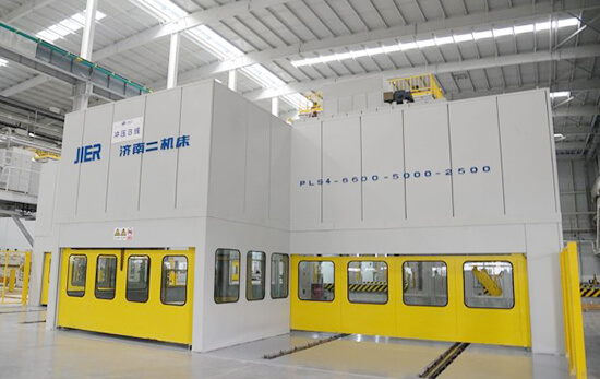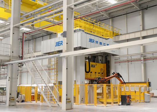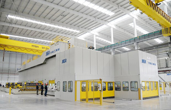 首先我們參觀了該工廠的沖壓車間,該車間共設計有兩條沖壓生產線、一條開卷落料線和一個模具修復線,均由濟南二機床集團生產的JIER沖壓機,目前該工廠僅啟用了一條高速沖壓生產線。