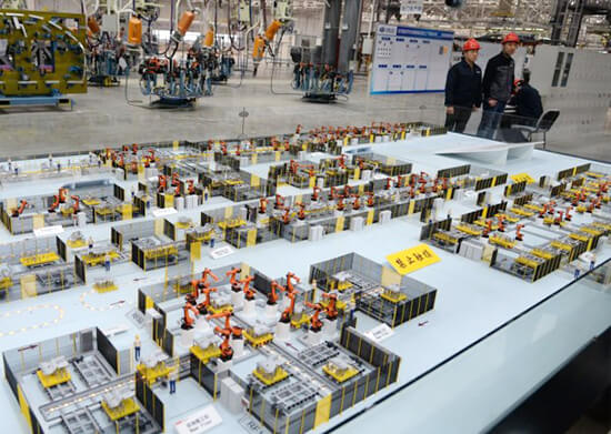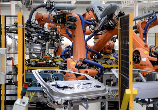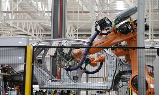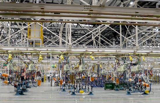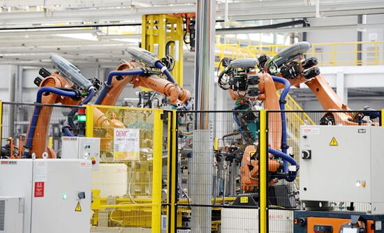 機器人焊接工位主要包括地板線、左右側圍線、車身主焊線,共配備有132臺庫卡機器人進行焊接作業。