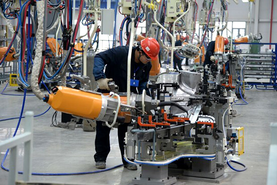 這條生產線由五序沖壓機組成,其中首臺沖壓機的沖壓噸數為2400噸,采用力士樂數控液壓墊。目前該生產線主要生產昌河Q25的車身及門板等外觀件,據了解該沖壓生產線可實現自動換模,換模時間僅需7分鐘。該生產線可每分鐘沖壓10-12次。此外,沖壓生產線內部由來自瑞士gudei生產的單臂機器人進行上料和抓取作業。