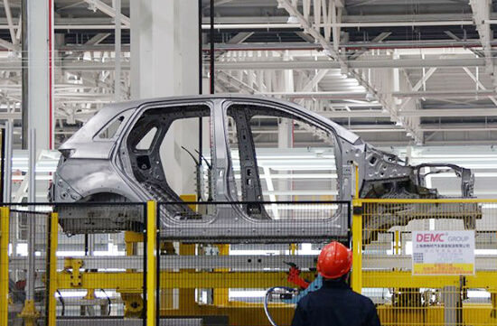 當AGV到達車輛下方時,兩名操作員會按下控制升降臺的按鈕,使升降臺向上抬升,將后橋和副車架抬抬升至車身下方,從而降低了合車的難度。由于目前Q25仍處于試生產階段(當日計劃生產10輛/班),我們僅看到了一臺正在進行合車作業的待裝車。