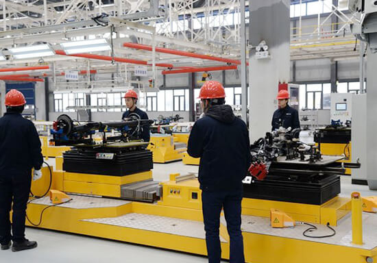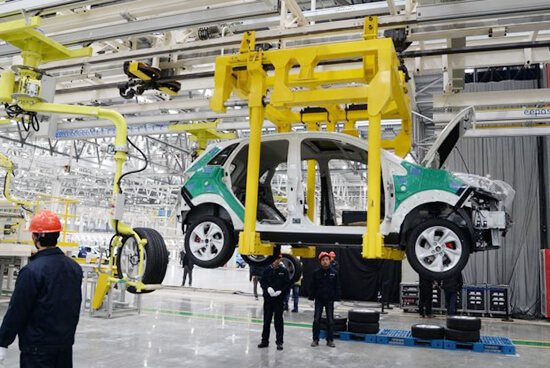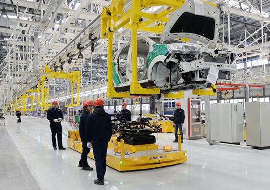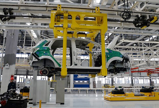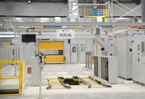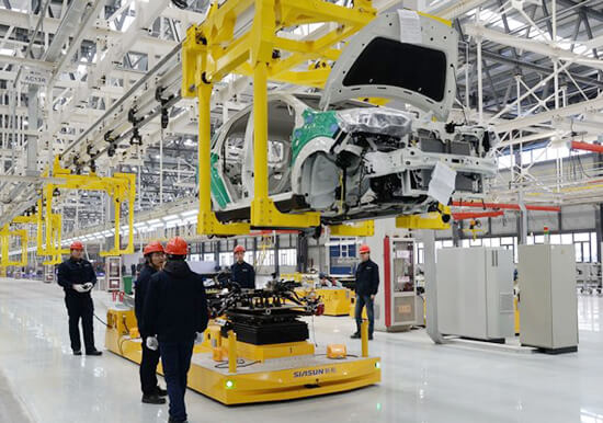 在合車工位上,由后橋分裝生產線和副車架成產線組裝的零件將由沈陽新松生產的AGV自動導引運輸車運送至車體下方,從而方便零部件在不同工位上運輸。