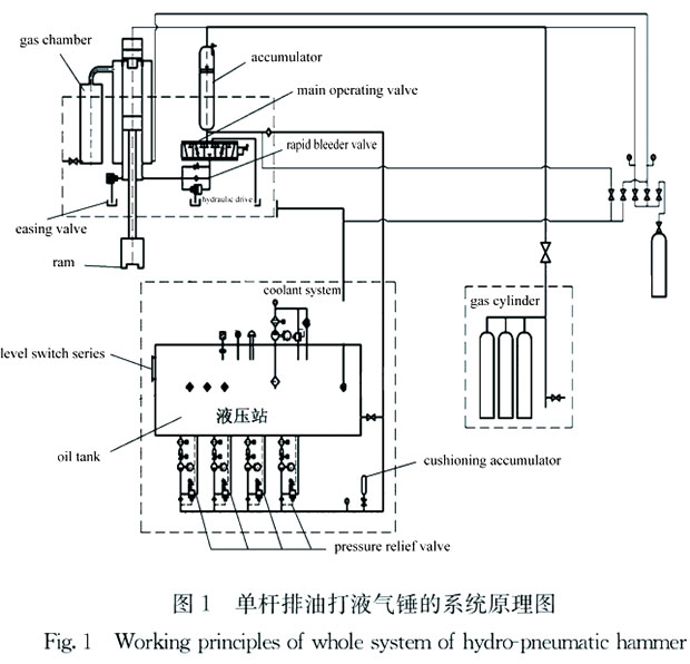 前言 目前社會生產的發展對鍛造設備提出了如下更高的要求: ① 提高設備生產率,降低設備故障率,適應鍛件交貨期短的趨勢; ② 提高設備的通用性,適應多品種小批量生產的趨勢; ③ 提高設備精度從而提高產品精度并且降低原材料消耗; ④ 提高可維修性及安全性; ⑤ 節約能源,改善工作環境; ⑥ 提高設備數字化和自動化能力。 1 單桿排油打液氣錘的工作原理 單桿、排油打液氣錘液壓系統如圖1所示。其工作原理是:在錘桿活塞上腔密閉一定體積和壓強的氣體,錘桿活塞下腔連通受控高壓油。當液壓站提供的高壓油,經過主操縱閥、快放閥進入錘桿活塞下腔時,錘頭回程,同時錘桿活塞上腔密閉的氣體被壓縮蓄能。當主操縱閥換向,快放閥在壓差作用下快速打開,錘桿活塞下腔受控高壓油快速泄低壓時,錘頭打擊。其技術的關鍵在于主操縱閥和快速放液閥的性能。