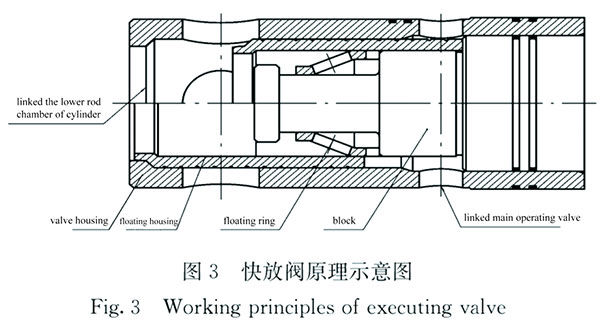 由圖2可知,液氣錘主操縱閥為一特殊設計的隨動閥,是滑閥機能。其靈敏性和密封性能是靠閥芯和隨動閥的間隙和掩蓋量控制的,這是矛盾的統一體,掩蓋量小,隨動閥的靈敏性好,錘頭的靈活性高,但同時密封性能和壽命差;掩蓋量大,密封性能好,但同時隨動閥的靈敏性差,錘頭的靈活性差。在生產過程中,操縱手柄每操控一次,隨動閥也會運動一次,錘頭跟隨運行一次。錘頭運動越頻繁,隨動閥運行也越頻繁。當一定時間后,閥芯的掩蓋部分及隨動閥間隙均會變大。由液壓理論可知,環縫間隙的流量和環縫間隙的立方成正比。當間隙變大,內漏量明顯變大,這可在錘頭靜止不動時由系統卸荷次數直觀確定。主操縱閥內漏越大,系統溫升越快,溫度越高,介質油的粘度越低,從而促使內漏增大,形成惡性循環。嚴重時系統無法正常工作,必須更換主操縱閥。 另外,由主操縱閥的原理可知,在隨動閥跟隨閥芯移動過程中,需放油的驅動端仍通過小孔進油,只是進的少、排的多,這不僅影響隨動閥的靈活性,而且也是一個原理性的生熱點。不正常生熱都會造成能源的浪費。 2.4 冷錘現象 所謂的“冷錘”現象是指司錘在正常工作過程中,需要錘頭慢下時,錘頭卻形成打擊。“冷錘”是出現廢品甚至工傷的主要原因。打“冷錘”的原因是由于快速放液閥受到擾動不正常打開造成的。快速放液閥位于主操縱閥和錘桿活塞下腔之間,是一個液控開關。由浮動環、浮動套、閥套、后堵等組成。快放閥接受主操縱閥的指令,控制油液的進入和快速排放,保證鍛錘工藝動作的實現。其結構原理如圖3所示。