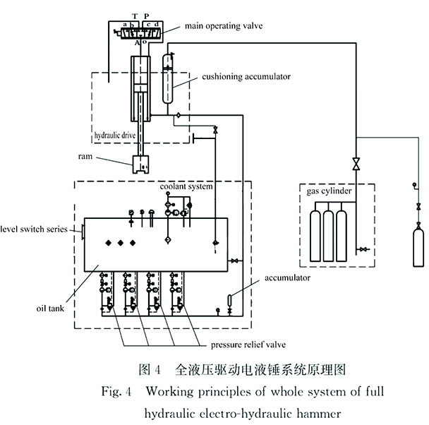 圖3中心線下部的所示是錘頭慢下時快速放液閥各零件的位置,浮動環右端與閥堵貼合,形成節流,浮動套右端油壓有所下降,但由于浮動套左端受高壓油作用的面積較右端小,使得浮動套仍能保持不動,錘桿活塞下腔高壓油經主操縱閥慢慢卸掉,錘頭緩慢下降。此時一旦出現不應有的擾動,浮動套就有可能打開形成打擊,即出現“冷錘”。浮動套一旦打開形成打擊,再想收錘就比較困難了。 2.5封下口噴油 封下口噴油是指大量高壓油瞬間從封下口噴出,噴到錘下的熱工件上就會造成著火。在生產過程中發生此故障往往都會造成非常嚴重的后果,甚至造成人員傷亡。造成此故障的原因一是由于封下口脫落,二是由于錘桿從中部斷裂。防止封下口脫落可采取定時維護來預防,但錘桿從中部斷裂是很偶然的,很難預見。為此有的用戶采用乳化液替代液壓油來充當驅動介質。但乳化液粘度系數小,潤滑性能差,水易揮發造成性能穩定性差。有的設備在封下口部位安裝行程開關或接近開關用以采集錘桿斷裂的信號,當采集到錘桿斷裂的信號后,馬上發訊關停電機。但液氣錘系統都設置了相當容量的蓄能器,如果只關停電機而不能封堵蓄能器,同樣會造成噴油著火事故。另外電器元件裝在鍛錘上易壞且不易察覺。最理想的是采集錘桿活塞下腔的壓力信號,用機械裝置封堵蓄能器。但液氣錘錘桿活塞下腔的壓力信號是交變的,低壓信號和錘桿斷裂噴油時的信號是相同的,所以對液氣錘來講靠采集錘桿活塞下腔的壓力信號,用機械裝置封堵蓄能器是不能實現的。 由此可見,雖然液氣錘和蒸-空錘相比已有了質的飛躍,經過許多工程技術人員的不斷總結和提高,液氣錘已在各種工況條件下、在各種規格系列的鍛錘上得到成功應用,但由于仍然存在上述的許多不足,為正常生產帶來許多不便,不能很好適應社會生產對鍛錘提出的新要求。要想徹底解決這些問題必須采用全液壓驅動液壓錘——電液錘。 3 全液壓驅動電液錘的原理 全液壓驅動電液錘是指錘頭的打擊和回程均為液壓油驅動的液壓錘。其原理是:錘桿活塞下腔常通高壓油,通過控制活塞上腔油的進出來實現打擊和回程。上腔進高壓油時,雖然錘桿活塞上下腔油壓相等,但錘桿活塞上端是一個圓的面積,錘桿活塞下端是一個環的面積,由于有面積差形成作用力差,再加上落下部分的自重實現向下打擊;活塞上腔泄低壓時,液壓油作用于活塞下端環面積的力克服落下部分的重力及相應的摩擦力實現回程。
