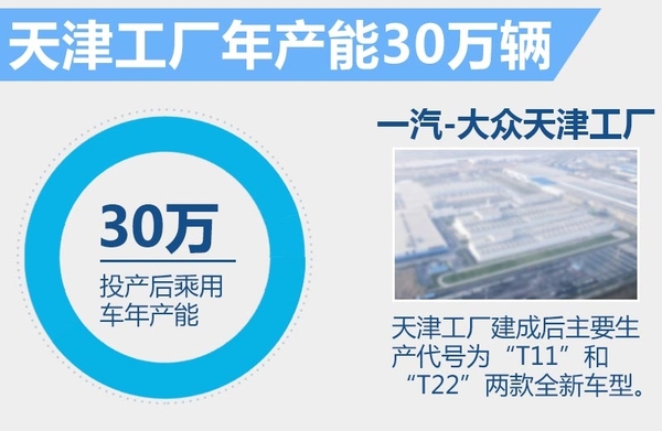 一汽-大眾目前在國內擁有4家整車制造工廠,分別為長春第一、第二工廠,成都工廠和佛山工廠,已形成年產近180萬輛的產能規模。2014年一汽-大眾共銷售新車1,780,888輛,總體產能已接近飽和狀態。近日,網上車市從天津環境保護局獲得了一汽-大眾投建天津工廠項目的環評信息,該項目預計2016年第一季度開工建設,至2018年第四季度建成投產,總投資達194.8585 億元,項目建成后天津工廠將實現年產乘用車30萬輛/年的規模,主要生產代號為“T11”和“T22”的兩款全新車型。