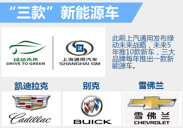 目前上汽通用旗下的三大品牌,僅有雪佛蘭賽歐SPRINGO一款純電動車,而凱迪拉克、和別克都沒有一款上市新能源車。根據此前上汽通用發布“綠動未來”戰略,包括別克在內的三大品牌基于各自主力平臺每年推一款新能源車,到2020年共推出10款新能源車。凱迪拉克旗下CT6 PHEV、雪佛蘭基于Bolt打造的純電動車,以及代號“D2JBI”的別克首款新能源車,上市后上汽通用的新能源產品陣容短期內增至三款。