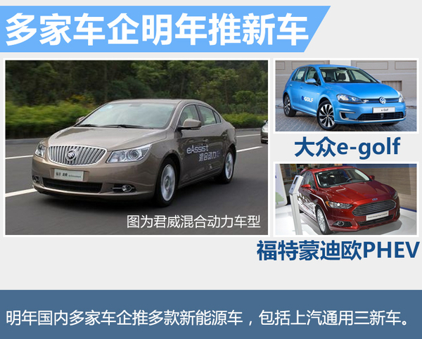 在當下國內新能源市場中,福特明年推蒙迪歐PHEV和C-MAX PHEV,而大眾也將在明年投產e-golf和高爾夫GTE,此外旗下全新C級轎車輝道PHEV和邁騰PHEV也將有望明年投產。總的看來2016年將是各大車企投產新能源車型的重要一年。在面對中國新能源車這一并未成熟的新興市場,別克在明年推出首款新能源車后,將與雪佛蘭和凱迪拉克組成上汽通用新能源車陣容,征戰這一新興市場。