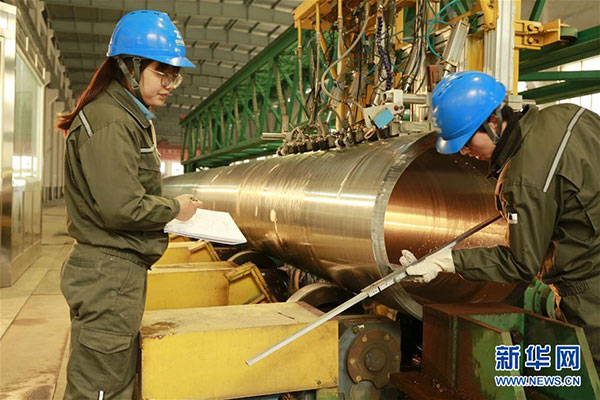 12月5日,技術(shù)人員采用世界先進(jìn)的超聲波探傷設(shè)備進(jìn)行產(chǎn)品質(zhì)量檢測。在我國石油化工、煤化工、核電領(lǐng)域的大口徑無縫特種鋼管長期依賴進(jìn)口的背景下,近年來,中興裝備瞄準(zhǔn)我國需要大量的大口徑厚壁無縫鋼管的市場需要,進(jìn)行科技攻關(guān),在2012年初成功研發(fā)出直徑610毫米、厚度68毫米的TP347不銹鋼無縫管。在此基礎(chǔ)上,該公司通過創(chuàng)新技術(shù)工藝,在制造過程中應(yīng)用了ESR精煉、固溶熱處理、高壓碎冷等多種新工藝、新技術(shù),并于今年6月,順利制造出直徑達(dá)711mm、管壁厚度達(dá)88mm的產(chǎn)品,經(jīng)國家鋼鐵研究總院、國家鋼鐵產(chǎn)品質(zhì)量監(jiān)督檢驗中心、南京航空航天大學(xué)等單位的聯(lián)合鑒定,該產(chǎn)品綜合性能達(dá)到國際先進(jìn)水平、可替代進(jìn)口、可應(yīng)用于石油化工、煤化工等領(lǐng)域,填補(bǔ)了國內(nèi)空白。到目前為止,中興裝備已經(jīng)成功研發(fā)生產(chǎn)出直徑219.1毫米—711毫米、壁厚29毫米—88毫米的13個TP347H系列產(chǎn)品,曾先后多次填補(bǔ)國內(nèi)空白,并取得了美國能源公司核電材料生產(chǎn)許可資格。