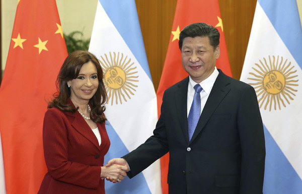 國家主席習近平4日在人民大會堂同阿根廷總統克里斯蒂娜舉行會談。 習近平指出,去年7月,我對阿根廷進行了成功的國事訪問,我同你共同宣布建立中阿全面戰略伙伴關系,就加強兩國各領域互利友好合作達成重要共識。在雙方共同努力下,我們達成的共識正在變為現實。中阿互利友好合作的新成果為兩國關系發展注入了強勁動力。我對中阿關系前景更加充滿信心。 習近平強調,中阿同為重要的新興市場國家,雙方應該密切交流合作,分享發展機遇,共同應對挑戰。兩國要加強全方位交往,發揮好兩國政府間常設委員會的統籌協調作用,落實好兩國政府共同行動計劃。要深化務實合作,利用好經濟合作與協調戰略對話等機制,推動雙方互利合作持續穩定深入發展。要建設好現有的鐵路和水電站等重點項目,積極開展基礎設施建設、農業、能源、礦產、裝備制造等領域合作,將核電作為下階段重點合作領域加以推進。要加強海關和質檢交流,推動雙邊貿易健康穩定增長,繼續加強金融合作,執行好本幣互換協議。中方歡迎阿根廷企業積極開拓中國市場,將一如既往支持中國企業赴阿根廷投資興業。中方愿同阿方加強在聯合國、國際貨幣基金組織、二十國集團、七十七國集團加中國等國際組織和多邊機制中的協作。