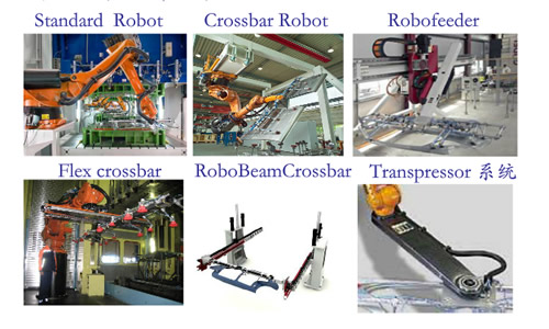 自動化線的6種主要搬運方式及代表性企業: 1、standard robot 普通機器人 瑞典ABB 德國KUKA 意大利CAMAU 日本FANUC 德國SCHULER 2、crossbar robot 橫桿機器人 德國SCHULER 瑞士GUDEL 3、bobot feeder 單臂機械手 德國STROTHMANN 瑞士GUDEL 4、flexcrossbar 瑞典ABB 5、robobeam crossbar 雙臂快速送料系統 德國SCHULER 日本小松 瑞士GUDEL 6、transpressor 德國KUKA 下面小編為大家介紹幾個國際知名的機器人企業在沖壓自動化領域所研發的最前沿的技術及設備。 1、德國KUKA集團——橫桿機器人 德國庫卡是世界幾家頂級為自動化生產行業提供柔性,生產系統、機器人、夾具、模具及備件的供應商之一。下面是德國庫卡公司與德國舒勒公司協同研制的汽車沖壓橫桿機器人。