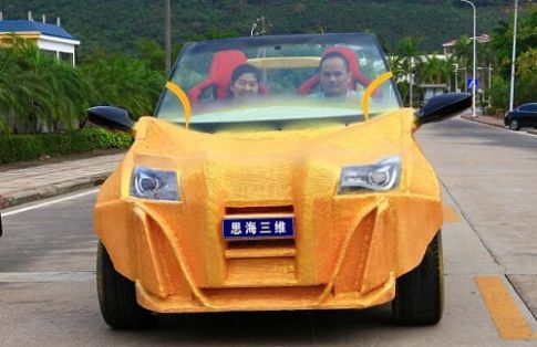 3月24日,中國首臺3D打印概念汽車在海南三亞發布。據了解,這臺概念汽車由三亞思海三維技術有限公司開發研制,“土豪金”色車身部分是運用復合材料3D打印而成,重約500公斤,其余為組裝配件,該車通過電力驅動。從設計到組裝完成僅耗時一個月,其中3D打印階段僅耗時5天。 |