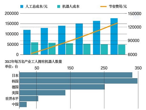 為什么需要機器人 中國已進入中等收入國家行列,勞動力成本的急劇上升倒逼企業(yè)轉(zhuǎn)型。以浙江省為例,制造業(yè)人工成本近年來急劇攀升,已接近人均1萬美元的水平線;“機器換人”之后,61.5%的企業(yè)至少減少10%的一線員工,其中16.3%的企業(yè)減少30%以上的一線員工。