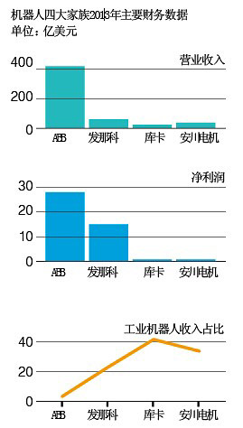 在工業(yè)機器人領(lǐng)域,德國庫卡,日本發(fā)那科(Fanuc)、安川,瑞士ABB四家企業(yè)遙遙領(lǐng)先,被戲稱為機器人“四大家族”。