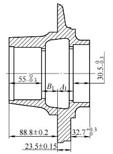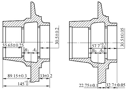 內孔、端面和法蘭面為該段工序的加工表面,如圖2中粗線所示。該段加工工序采用數控車床加工:法蘭A面貼平專用卡爪端面,卡爪夾緊外圓。車法蘭B面→車止口→車端面→車臺肩面5→車孔7→車孔8→車臺肩面6→車孔4→車孔3→車孔2。 通過該工序加工后,大約有15%的臺肩面5或臺肩面6無加工余量而導致廢品。通過調查,該輪轂半成品由兩個廠家提供,通過統計兩個廠家的半成品因臺肩面5或臺肩面6無加工余量產生的廢品率,發現廢品率相差不大,初步排除廠家制造問題。判定為加工工藝存在問題。 半成品的軸向尺寸及以上工序加工后軸向尺寸分別如圖3和圖4所示。