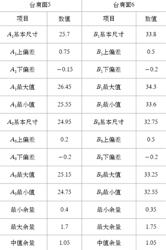 通過計算,加工余量見表1。由表1可知,在極限尺寸時,臺肩面5和臺肩面6都存在無切削余量的情況(余量–0.3mm),由此,可以判定半成品圖樣設計余量不合適導致廢品。 表1 臺肩面加工余量 (單位:mm)