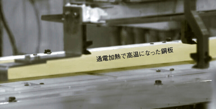 這項技術的特點是使用電加熱器來加熱鋼板。利用鋼板通入直流電后產生的焦耳熱,逐一加熱鋼板。這樣可將加熱時間縮短到了10~20秒(不到原來的1/20),從而實現了小型生產線。具體來說,用電加熱器將拉伸強度為590MPa的鋼板加熱至約900℃,并進行沖壓成型,然后在模具內冷卻,使強度提高至1470MPa。設備長度為2m,只有原來的火印設備的1/10。該技術可使設備投資額減少30%。