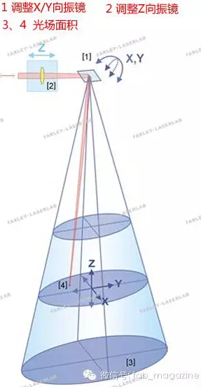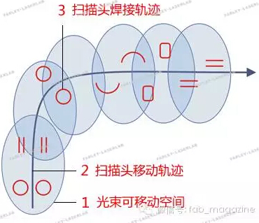 圖1 激光掃描焊接系統軌跡 相對于點焊,激光遠程焊熱輸入小、焊接變形小。 對于超過1000MPa的高強鋼,其強度越高對熱輸入量越敏感,激光掃描焊比點焊和MIG焊的熱輸入小,是焊接高強鋼的首選。 激光掃描焊的應用 由于傳統激光焊接系統在焊接位置之間的移動速度相對較低,在實際生產中很難達到大批量生產要求,這一缺點在焊點分布多的復雜三維零件上顯得尤為突出。高光束質量高功率新型盤形激光器和光纖激光器的應用推廣,為激光掃描焊接技術的實現奠定了硬件基礎。 激光掃描焊的原理介紹 掃描焊、遠程焊和飛行焊接指的是同一種激光焊接方法,激光掃描頭可以從500mm以外的位置進行激光焊接,通過內部振鏡的運動,在不移動激光頭的情況下,可以進行類似光掃描的焊接,此種焊接方式速度快,移動位置精準度高,通常使用機器人來控制激光掃描頭的移動軌跡,結合掃描頭本身的高速焊接及外在空間上的凌空感,人們又將它取名為“飛行焊接”,其焊接原理圖如圖2所示。此種焊接方式在每個光場面內移動速度快,僅在兩個光場間需要時間來調整振鏡角度,以準備下一個光場面的焊接,因此激光掃描焊對于多點位置的短距離焊接有固有的優越性。