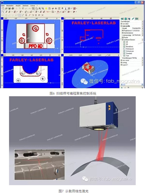 圖4 激光掃描焊的接頭設計 激光掃描焊接系統 激光掃描焊接系統的組成如圖5所示(其主要特性見表2),與傳統的激光焊接設備相比,差異主要體現在激光頭上。激光掃描焊焦距可達212mm,工作區域可達100mm×100mm×40mm(Z向40mm),在X/Y向的定位時間小于0.01s,在Z向的定位時間小于0.1s。通過可編程系統(圖6)及示教用線性激光(圖7)的輔助,可實現激光掃描焊的軌跡模擬和優化。