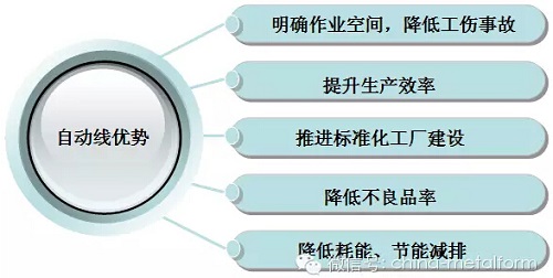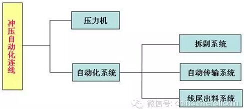 圖1 沖壓自動線的組成構架 目前國內沖壓線主要還是以手工線為主,而手工線的面臨著如下等問題: ①多臺布局、單臺操作、手工傳遞、生產效率低; ②且人為因素多,不良品居高不下; ③耗能高、生產成本高; ④沖壓現場管理復雜、易發(fā)工傷事故; ⑤用工成本逐年遞增。 基于以上問題,沖壓自動線已成為代替手工線的必然與趨勢,沖壓自動線有著如下圖所示特點: