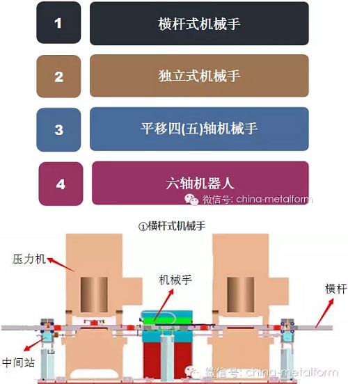 沖壓生產線分為多機連線沖壓生產線和單機多工位沖壓生產線。 1、多機連線沖壓生產線 是多臺壓力機并肩排列在一起,壓力機之間采用機械手或者機器人取料、放料,生產線首尾根據要求可以配置單、雙工位上料車,機器人上下料。 常見的多機連線沖壓機械手分為四類,如下圖所示:
