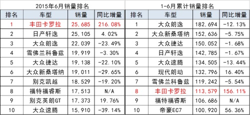 隨著6月汽車行業(yè)銷量數(shù)據(jù)的發(fā)布,2015年上半年中國汽車市場的表現(xiàn)也塵埃落定。讓人意外的是,一汽豐田的卡羅拉將霸占緊湊型車排行榜首多時的朗逸擠下寶座。一汽豐田也憑借著卡羅拉的逆勢熱銷,實現(xiàn)了上半年銷量的正增長。然而,風光的背后卻也有危機的一面。 銷量暴漲156% 卡羅拉奪得階段性銷量冠軍 2015年6月,卡羅拉單月銷量達到25,685輛,受去年同期產(chǎn)品換代影響,同比暴增216%;1-6月累計銷量達到113,579輛,同比增加156%。