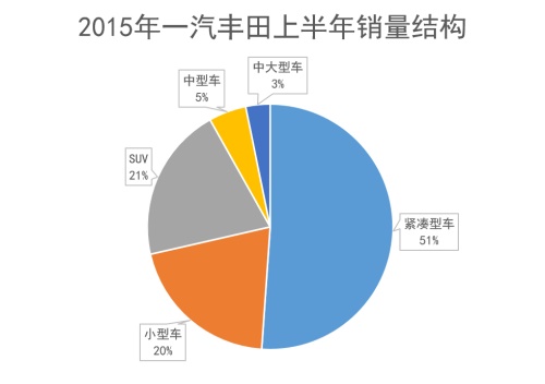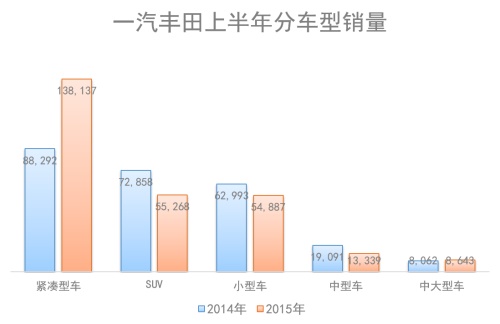 第三,一汽豐田的強勢市場規(guī)模在萎縮。如上圖所示,中國汽車市場上半年表現(xiàn)中,緊湊型車市場銷量同比下降4.15%,小型車下降15%,中型車下降1.67%,而前兩者恰好為一汽豐田目前的銷量支柱所在細分市場。