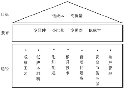 為了高效、優質、低成本地解決轎車沖壓件生產問題,從沖壓工藝角度要減少沖壓件品種,生產時要減少批量增加批次;要提高生產節拍,減少生產轉換時間。同時,要盡可能地采用國產板料及低成本板料。為了提高板料利用率,一方面要提高工藝及排樣水平;另一方面要盡可能采用卷料,并且完成輕量化的激光拼焊板的準備。同時,為降低成本,在保證質量及工藝要求的前提下,要盡量減少投資。本文從工藝、材料、設備、模具等角度分析精益理念在具體生產中的應用。精益生產與沖壓工藝的內在聯系,如圖1所示。