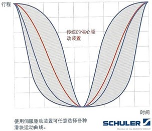 3、滑塊伺服直驅系統 全伺服多工位冷鐓機同半伺服多工位冷鐓機的主要區別就是滑塊伺服直驅技術,代表著伺服技術目前在壓力機上的最高應用水平,也切實體現了伺服技術的應用效果。 3.1 簡化結構,降低能耗 傳統的滑塊驅動系統由電機、飛輪、離合和制動系統、曲軸、連桿組成,由電機帶動飛輪,通過離合和制動系統驅動曲軸連桿帶動滑塊運動。 滑塊的伺服直驅系統則省掉了飛輪和離合系統,直接由伺服電機驅動曲軸連桿帶動滑塊運動。從而簡化了機械結構,同時還避免了復雜機械結構所帶來的能耗,從整體上節能降耗。 3.2 滑塊運動軌跡隨意可控 全伺服多工位冷鐓機可以通過伺服直驅系統對滑塊的運動軌跡進行編程,同伺服喂料系統、伺服傳送系統進行無間的匹配,從而達到提高模具壽命、提高產品精度及生產率的最佳效果,并可生產鈦合金、高強度合金等難成形材料及復雜成形零件。由于省掉了飛輪和離合/制動組合,避免了飛輪到滑塊傳遞能量時的沖擊,整個鍛造過程非常平穩。