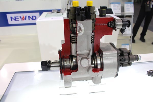 新風(fēng)此次展示的中型共軌系統(tǒng),主要用于輕卡、中卡發(fā)動機(jī),目前的市場占有量是新風(fēng)所有共軌系統(tǒng)中最大的。該系統(tǒng)采用高壓油泵燃油潤滑,杜絕了機(jī)油混入燃油中,可以改善排放,降低燃燒顆粒和油嘴結(jié)焦幾率;此外,噴油嘴使用中空蓄壓技術(shù),可以防止油嘴偶件卡死,提高油品適應(yīng)性,降低故障概率;且噴油器可以靜態(tài)零回油,從而降低燃油回油溫度,改善燃油消耗量。