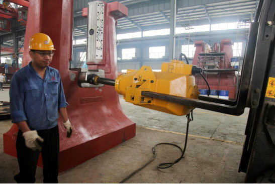 安陽(yáng)鍛壓公司3米數(shù)控輾環(huán)機(jī)生產(chǎn)線在羅馬尼亞投入使用 5.安陽(yáng)鍛壓公司成功研制鍛造打楔鐵機(jī): 2015年,安陽(yáng)鍛壓公司成功研制出鍛造打楔鐵機(jī),該設(shè)備很好地解決了困擾廣大鍛造廠多年更換模具效率低、不安全的問(wèn)題。安鍛公司生產(chǎn)的鍛造打楔鐵工具采用德國(guó)先進(jìn)技術(shù),與合適的叉車(chē)配合使用,用于打進(jìn)和打出鍛錘上的楔鐵,效率高,安全可靠。