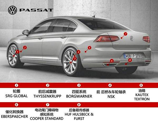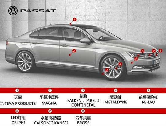 全新邁騰就要在下個月上市了,由于邁騰在中國B級車市場有著不錯的銷量,這次又是時隔多年的全新換代,因此市場關注度頗高。大眾也想繼續把邁騰打造成B級車的標桿,由于全新的邁騰使用了MQB平臺,在平臺技術上比帕薩特先進一代,因此全新邁騰的整體實力也要高于帕薩特。最近我在海外網站上看到了國外媒體對邁騰零部件供應商的文章,覺得很有意思。由于邁騰在德國的名字依然是帕薩特,因此文章中圖片的水印依然是PASSAT字樣。 全新的邁騰最早是在2014年的巴黎車展上亮相的,目前已經在海外上市,國產本版也會在下個月上市。德國版邁騰的三圍尺寸,車長 4767mm,寬1832mm,高1456mm,軸距2791mm,國產版在此軸距的基礎上再次加長,達到了2871mm。這次國外媒體公布是德國版大眾邁騰,柴油版車型的零部件供應商。當然國產后的車型,零部件供應商會根據國產后的具體情況進行調整。